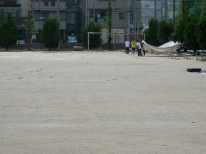 昨夜の大雨と強風でぬかるんだグランドを早朝から体育委員や部活動のメンバーで協力して水抜きをしました。グランドに設置していたテント2張りもグランドの端まで吹き飛ばされていました。一度バラバラに崩して、建て直しました。