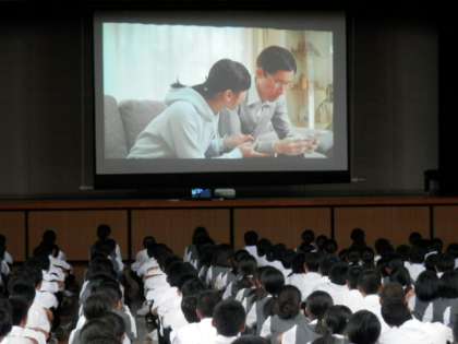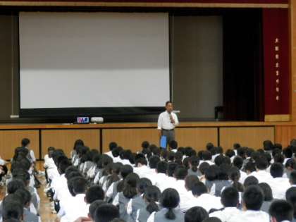 午後から1・2年生合同で非行犯罪防止教室を受講しました。城東警察の少年係長様を講師に招き、中学生に関係して日常的に発生している問題行動や犯罪行為について、特に城東区内の様子を中心に具体的な例をあげながら教えていただきました。スマートフォン使用などで陥りやすい問題点などについてもDVDを使って教えていただきました。より安全、安心な生活を過ごすためにも、今日の話を今後の生活に活かしてほしいと思います。