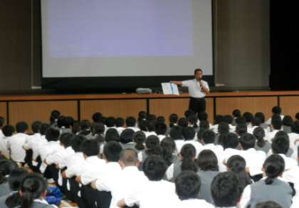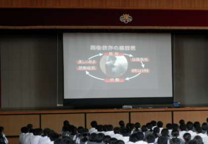 本日5時間目に3年生を対象とした生活安全教室を行いました。城東警察少年係から講師の方を招いて、中学生が巻き込まれやすい問題などについて具体的な例を取り上げて話していただきました。特に、薬物依存については、DVDを使って、その依存性について教えていただきました。