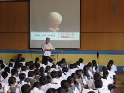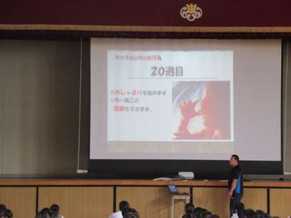1年生は格技室で「生命の誕生について」、2年生は体育館で「男女交際について」それぞれ、DVDやパワーポイントを使っての説明を行いました。いずれも「命の大切さ」「重み」について考える内容でした。