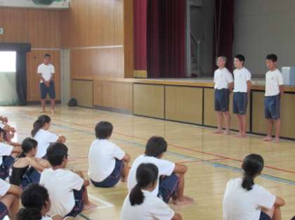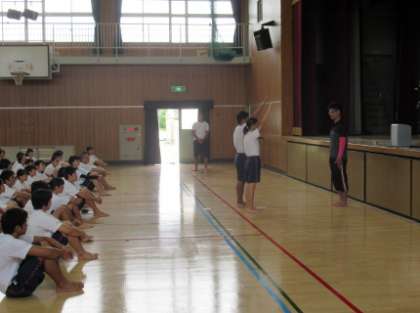 9月に入り、急に朝晩が涼しくなってきました。体調を崩さないようにしてください。本日は、3年生の水泳大会を行いました。朝から体育委員が準備に集合し、綿密な打ち合わせをして、準備をしてくれました。開会式は体育館で行いました。