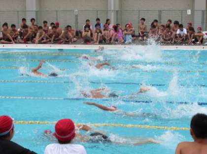 生徒の力で創りあげる水泳大会。平素の体育の授業では、なかなか見ることができない学年の仲間の素晴らしい泳ぎをたくさん見ることができました。