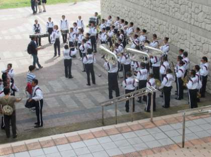 本日、大阪府マーチングコンテストが舞洲アリーナで行われました。本校は、中学校の部で参加、「コンサートバンドとジャズアンサンブルのためのラプソディ」 「ナイト フライト」と「星に願いを」演奏。演奏と共に複雑な動きをやりきり、見事に金賞を受賞、関西大会へと進出することが決まりました。プログラム順に菫の出番がコールされた時、スタンドから「菫ファイトー、菫頑張れー!」の声援の大きさがとても心強く感じました。保護者の方々はもちろんのこと卒業生もたくさん応援に来てくれました。いつもありがとうございます。感謝の気持ちで一杯です。