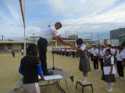 全校集会で吹奏楽部と水泳部に表彰状の授与を行いました。