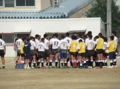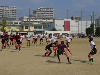 午前10時から大阪市秋季総合体育大会、ラグビーフットボールの部、準々決勝4試合が本校のグランドで行われました。本校のラグビー部は第3試合で東生野中学校と対戦。56対7で勝利し準決勝へ進出しました。本日もたくさんの保護者の方々に応援に駆けつけていただきました。ありがとうございました。3年生は、優勝を目標に最後の最後まで「菫ラグビー」が展開できるようにと頑張っています。優勝まであと2勝!