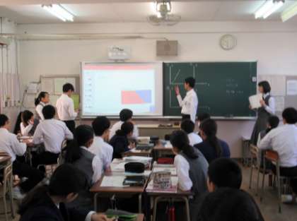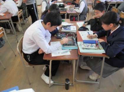 3年生の数学では図形が移動して重なった部分の面積を求め、グラフ化する学習を深めました。各グループに1台、タブレットを使用し、重なる図形の変化から面積を調べました。各班から考え方の説明を発表していました。