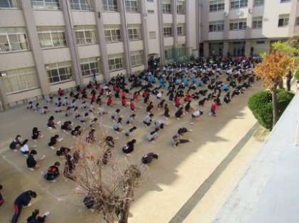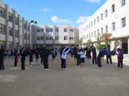 土曜授業の後に、PTAが後援するマラソン大会が行われました。PTAの方々には、昨夜に続き、本日も早朝から炊き出しの準備をしていただきました。希望者によるマラソン大会でしたが、約380人が参加する大会となりました。午前11時、中庭に集合し、開会式をしてから城北運河の遊歩道へ移動しました。準備運動は中庭で行いました。