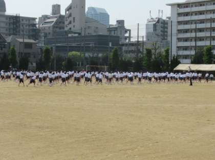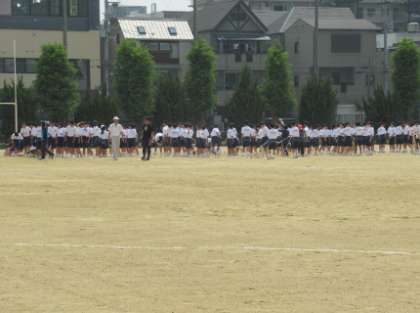 体育大会の1回目の学年練習を行いました。本日は、真夏を思わせるような暑さでしたが、朝から2時間ずつ各学年ごとの練習をグランドで行いました。2年生の練習では、行進や体操、各種目合わせなどを行った後、百足競争の練習を行いました。