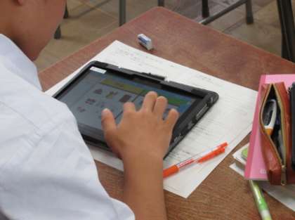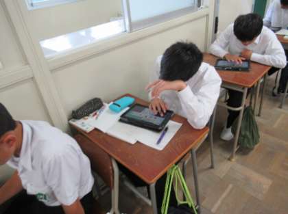 3年生の家庭科の授業では、タブレットを活用した受業を行っていました。資料の配付、回収機能を使って、物資とサービスを仕分ける学習に取り組んでいました。並び替えた各自のノートは、各自のタブレットから先生へオンライン提出を行いました。生徒は、慣れた手つきで作業を行っていました。