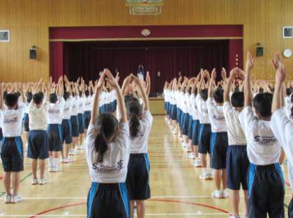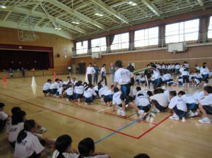 体育大会の学年別練習の2回目を行いました。本日は、雨が上がっていたのですが、グランド状態が悪く、3学年とも体育館で行いました。1年生では、行進や体操の練習の後、学年種目の練習も行いました。本番まで屋外で練習する時間は無いかもしれません。みんな真剣に取り組んでいました。