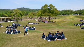 予定通り、滋賀県の希望ヶ丘文化公園に到着。広場で昼食を食べています。