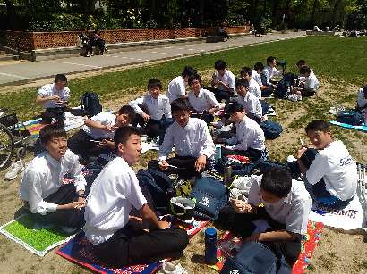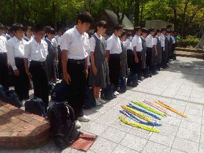 体験学習と班別散策を終えた後、班ごとに昼食をとり、東遊園地の「希望の灯り」で震災で被害に遭われた方々を想い、自分たちが心を込めて作った千羽鶴を捧げました。
