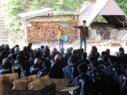 天候に恵まれ2日目がスタートしましたが、全体的に少し時間が遅れています。野外炊事のスタートも約45分遅れました。清掃点検や集合など細々としたところで少しずつ遅れています。写真は、野外炊事前の説明の様子です。