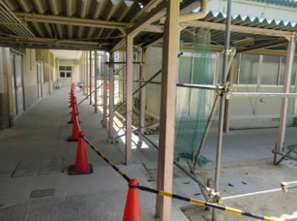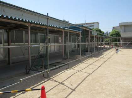 一泊移住の代休で休んでいた1年生が本日登校し、全校生徒が揃いました。学校では、昨日から給食調理室を建設するための工事が始まっています。体育館横に建設しますが、昨日からプレハブ周辺を囲むようにフェンスを建てる骨組みの作業が始まりました。生徒への安全を第一に工事を進めて行きます。