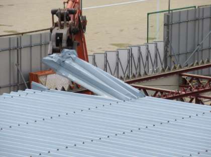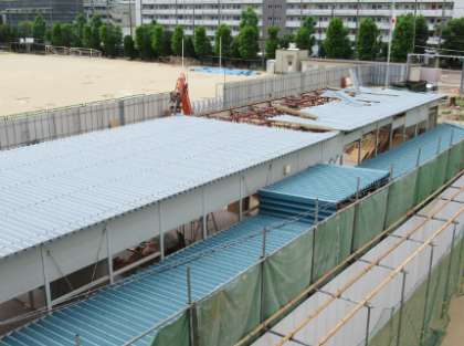 給食調理室の建築に伴うプレハブ校舎の撤去、解体作業が本格的に始まりました。今日から、プレハブ本体の解体に取りかかっています。
