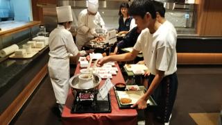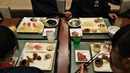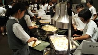 夕食は、ビュッフェスタイルのバイキング。学級ごとに、入浴と並行して行いました。