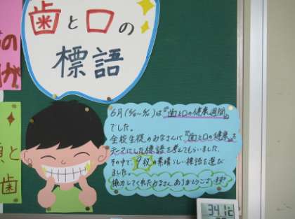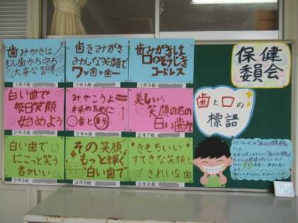 保健室横に掲示された「歯と口の健康」を呼び掛ける生徒作の標語(各学年ベスト3)