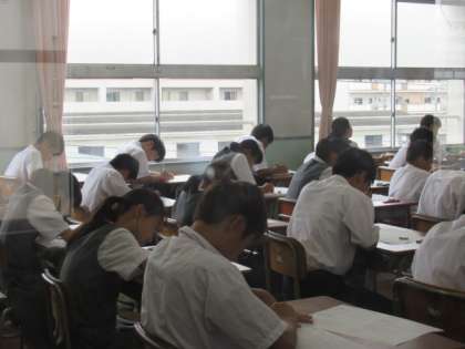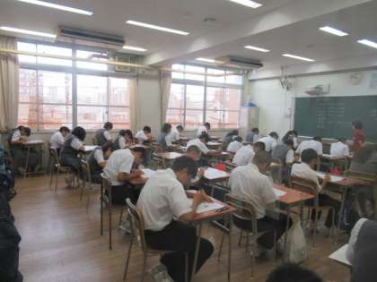 本日は、3年生で実力テスト、1.2年生で夏休みの課題テストを行いました。3年生は、昨日のチャレンジテストに続いてのテストとあって、少し疲れている様にも思えました。