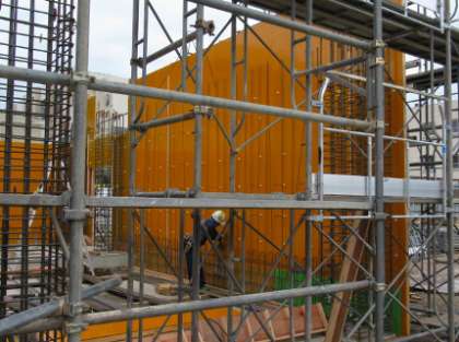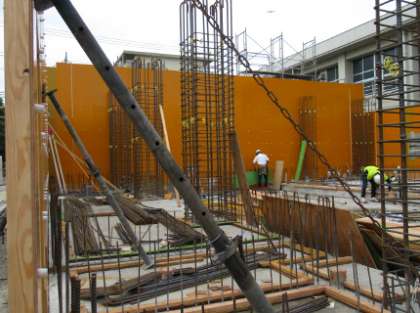 先週の台風の影響で日程が少し遅れていた給食調理施設の工事ですが、いよいよ基礎の上にコンクリート隔壁を造る鉄骨が組み込まれ、コンクリートを流し込む壁面ボードの組み立てが始まりました。