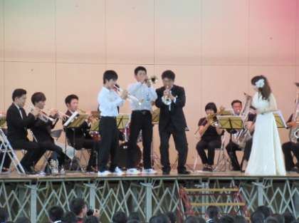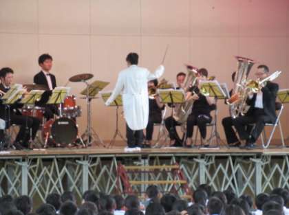 芸術鑑賞会を行いました。3年周期で古典、演劇、音楽と回転している中で、今年度は、音楽の年度でした。ザ・ブラスコンソートというメンバーの方々に来校いただき、金管楽器の素晴らしい音色を聴かせていただきました。また、途中は楽器や指揮体験をさせてもらい、トランペットは、簡単には音が出せないと言うこと、指揮することの難しさも教えていただきました。