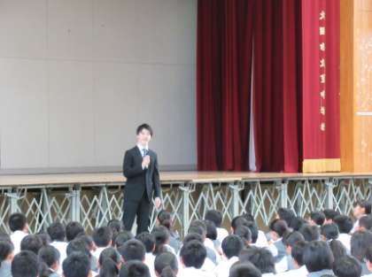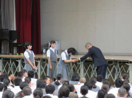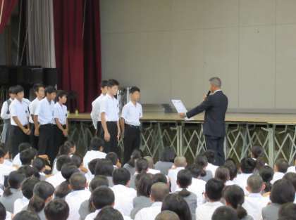そして、部活動で受賞している表彰の紹介を一部行いました。本日は、放送部と水泳部に表彰状を授与しました。