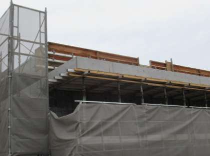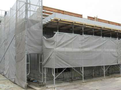 本日、給食調理棟の外壁コンクリートを囲んでいた木枠の取り外しが始まりました。