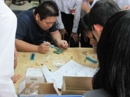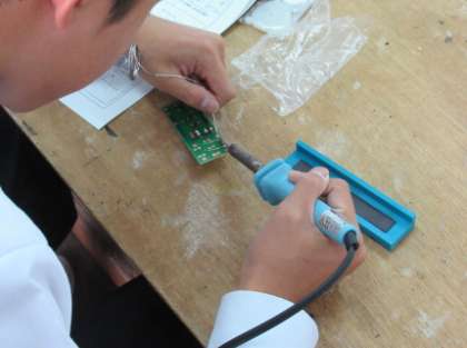 2年生の技術の時間では、防災グッズにもなる充電池式の携帯ラジオの組み立てが始まりました。本日は、本格的な組み立てをする前に、基盤に抵抗やトランジスタを回路に沿って取り付ける半田付けの練習を行いました。適量の半田を溶かして基盤に流し込む作業を慎重に取り組んでいました。