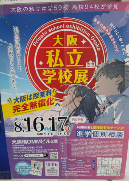 大阪私立学校展が8月16日(土)と17日(日)に天満橋OMMビル2階で開催されます。事前予約は不要です。両日ともに午前9時から午後4時に開催されます。暑い中、またお忙しい中かと思いますが、いい機会ですので、積極的に参加してみてください。