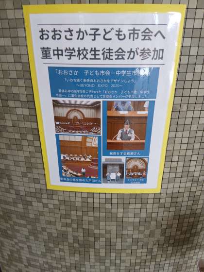 本校の生徒会2名が先日開催されました「おおさか 子ども市会」に参加しました。玄関ホールに、お二人が活躍している様子が掲示されています!とても素晴らしいポスターです!ありがとうございました。登校時にご覧ください。