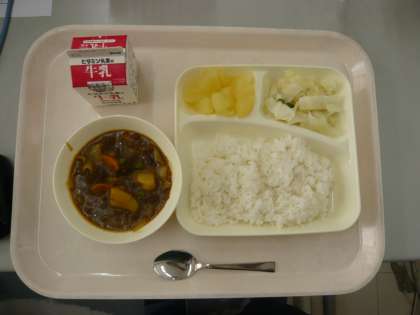 本日の給食は、ビーフカレーライス、野菜のピクルス、りんご(カット缶)、牛乳でした。