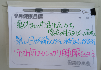 先日、9月の生徒専門委員会を終え、保健委員会で決まった今月の目標が保健室前に掲載されていました。ご紹介いたします。