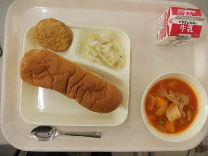 本日の給食は、チキンレバーカツ、ケッチャップ煮、キャベツのバジル風味サラダ、黒糖パン、牛乳でした。
