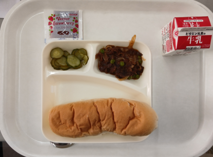 本日の給食は、牛肉のデミグラスソース煮、ウインナーのスープ、きゅうりのピクルス、コッペパン、いちごジャム、牛乳でした。