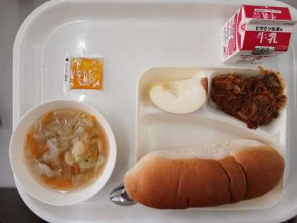 本日の給食は、なすのミートグラタン、鶏肉とキャベツのスープ、りんご、コッペパン、みかんジャム、牛乳でした。