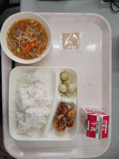 本日の給食は、とり天、どさんこ汁、抹茶団子、ごはん、牛乳でした。