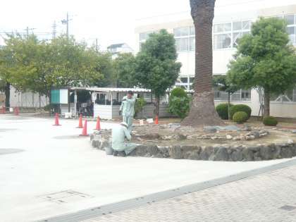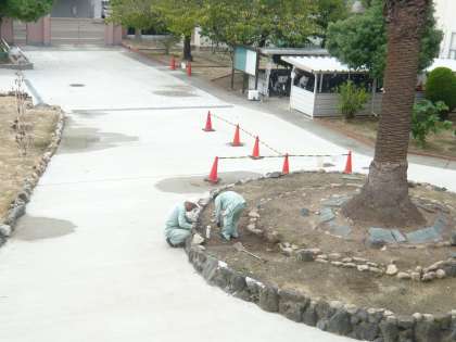 管理作業員の方々が、暑い日・雨の日関係なくいつも校内の美化、整備をしてくださっています。今日は、中庭フェニックスの土台となる所を整えてくださっています。いつも丁寧に対応していただきありがとうございます
