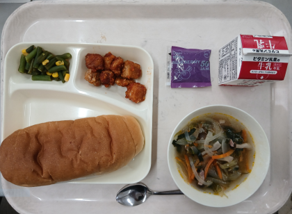本日の給食は、まぐろのオーロラ煮、スープ、三度豆とコーンのサラダ、コッペパン、ブルーベリージャム、牛乳でした。
