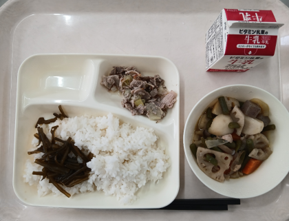 本日の給食は、豚肉の梅風味焼き、ふきよせ煮、くきわかめのつくだ煮、ごはん、牛乳でした。