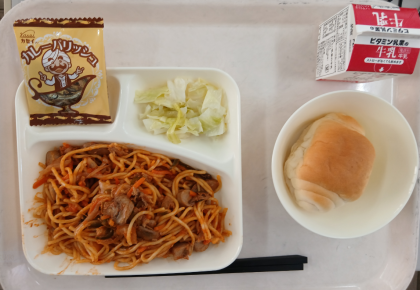 本日の給食は、イタリアンスパゲッティ、サワーキャベツ、カレーフィッシュ、ミニコッペパン、牛乳でした。