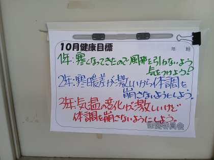 10月の生徒専門委員会を終え、保健委員会で決まった今月の目標が保健室前に掲載されていました。ご紹介いたします。