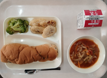 本日の給食は、白身のフリッター、ミネストローネ、ブロッコリーのサラダ、レーズンパン、牛乳でした。