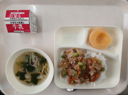 本日の給食は、ピリ辛丼、中華スープ、白桃(缶)、牛乳でした。