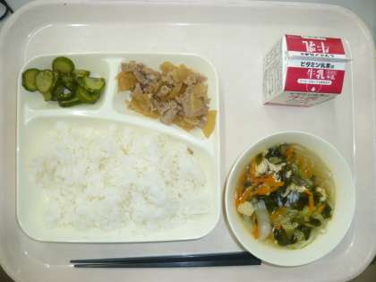 本日の給食は、豚肉のコチジャンいため、鶏肉とはるさめのスープ、きゅうりのナムル、ごはん、牛乳でした。