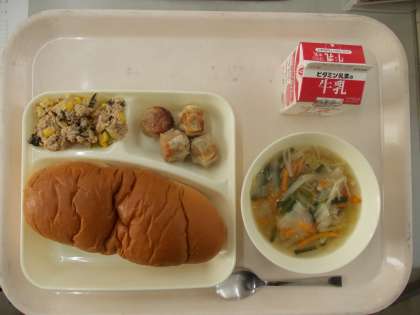 本日の給食は、焼きシューマイ、中華スープ、ツナとチンゲン菜のいためもの、黒糖パン、牛乳でした。