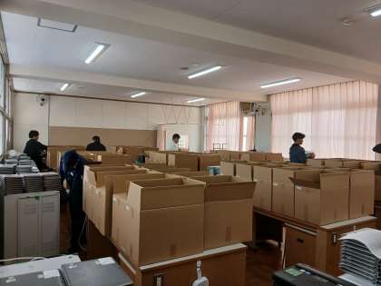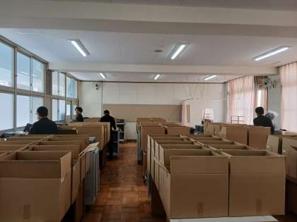 本日、新しい端末が届きました。みなさんがスムーズに使用ができるよう、古い端末との交換作業をしていただいております。新しい端末開きは、3年生は11日(木)、2年生は15日(月)、1年生は12日(金)となります。新しいパソコン楽しみですね。本校教職員の方々含め、ご対応ありがとうございます。