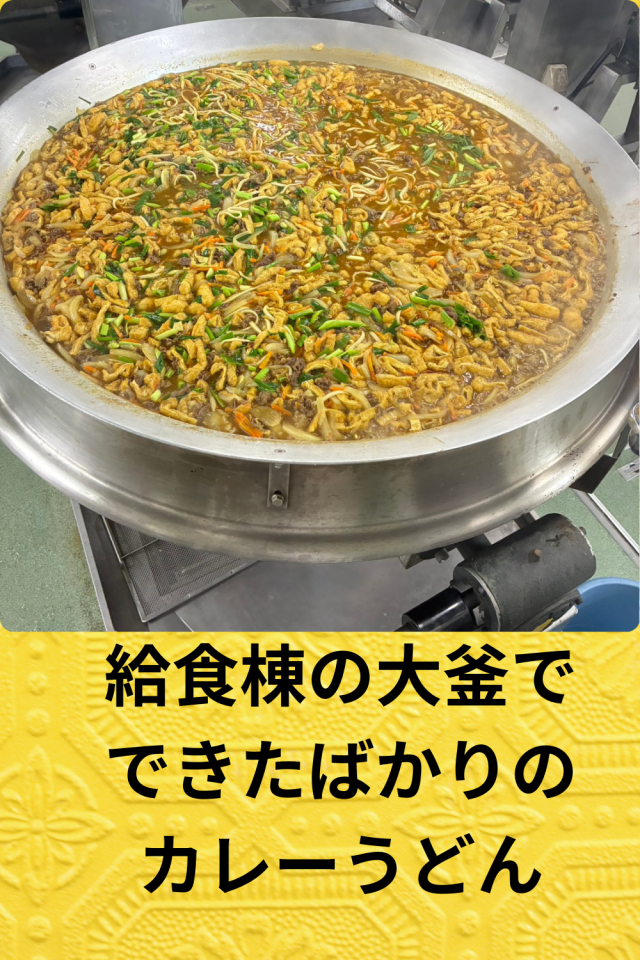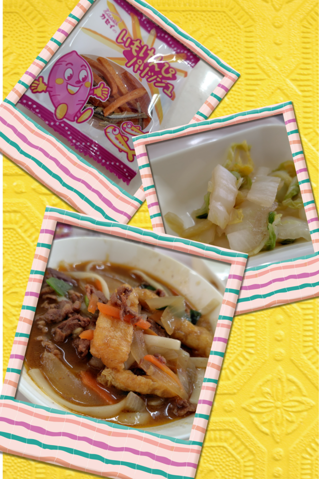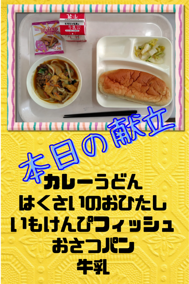 本日の給食は、カレーうどん、はくさいのおひたし、いもけんぴフイッシュ、おさつパン、牛乳でした。