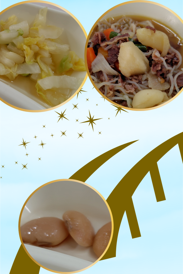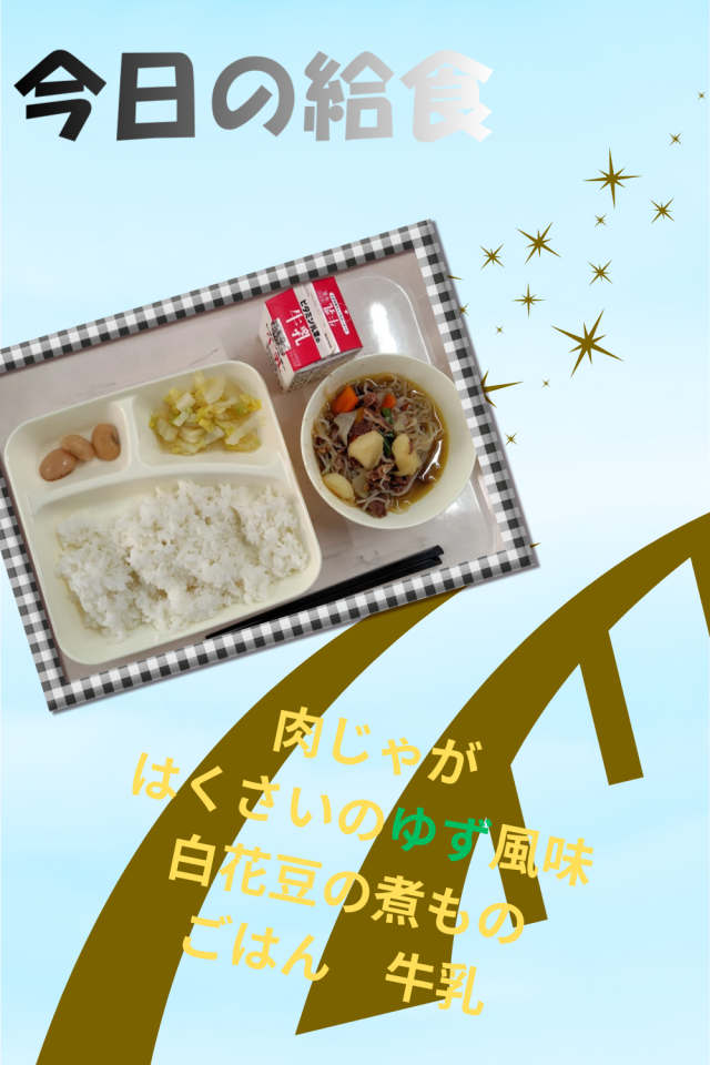 本日の給食のメニューは、肉じゃが、はくさいのゆず風味、白花豆の煮もの、ごはん、牛乳でした。