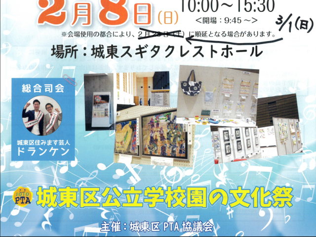 2月8日に開催予定の城東区PTAフェスタが明日3月1日(日)に城東区スギタクレストホールにて開催されます。本校からもたくさんの生徒のみなさんが参加します。