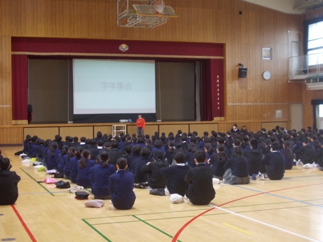 今日は1年生の学年集会日でした。とても興味深いお話をパワーポイントを使用し、分かり易くお話ししていただきました。