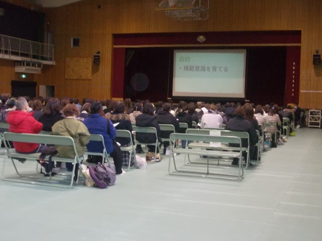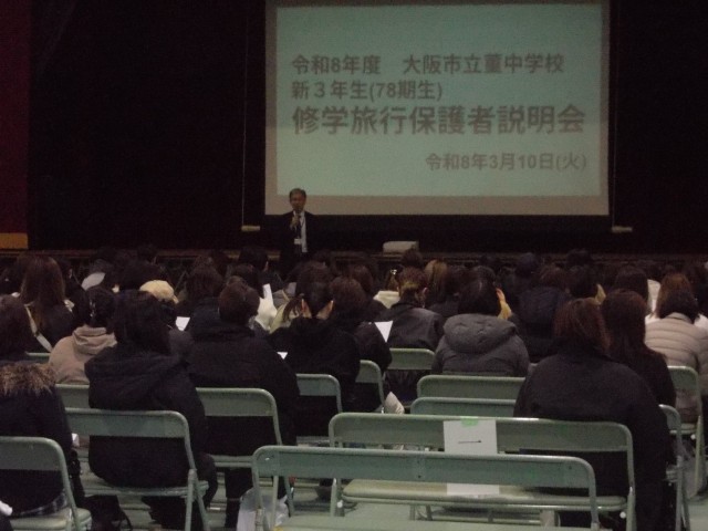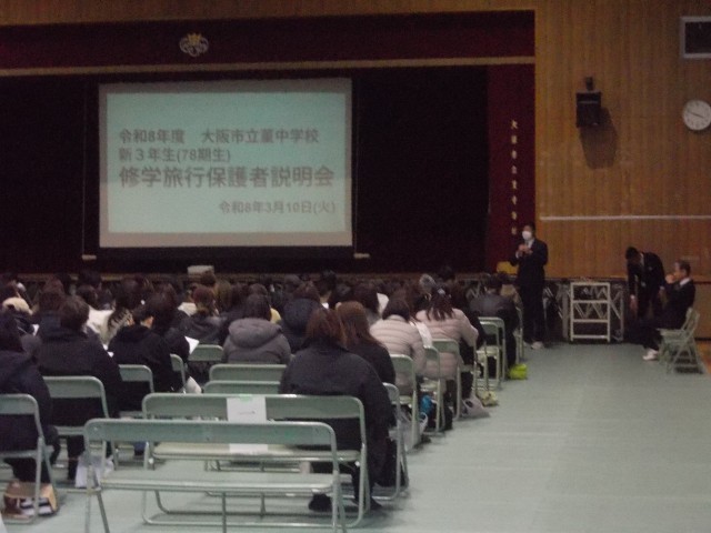 本日、放課後に修学旅行保護者説明会が行われました。学校長のあいさつのあと、修学旅行の概要について、パワーポイントを使用し、学年主任より説明がありました。
